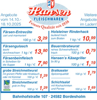 Neu in Bordesholm, bei Hansen Fleischwaren Feinste Qualität seit 1938 Einkauf 24/7 im Verkaufsautomaten direkt vor dem Laden! Bahnhofstraße 107 • 24582 Bordesholm